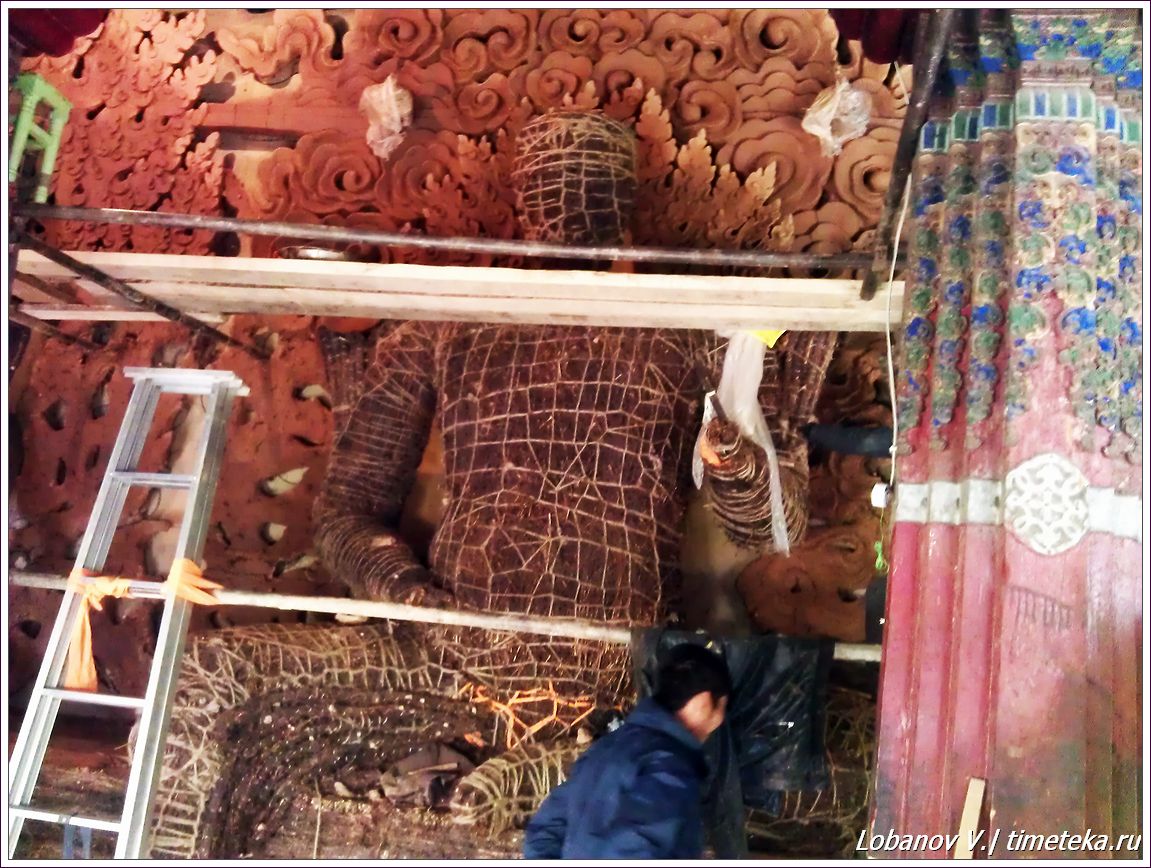 Так вот, такие статуи Просвященного, как на фото слева, делаются из … сена (фото внизу), покрываются глиной и далее золотой краской.Иногда даже с реальным добавлением золота.
