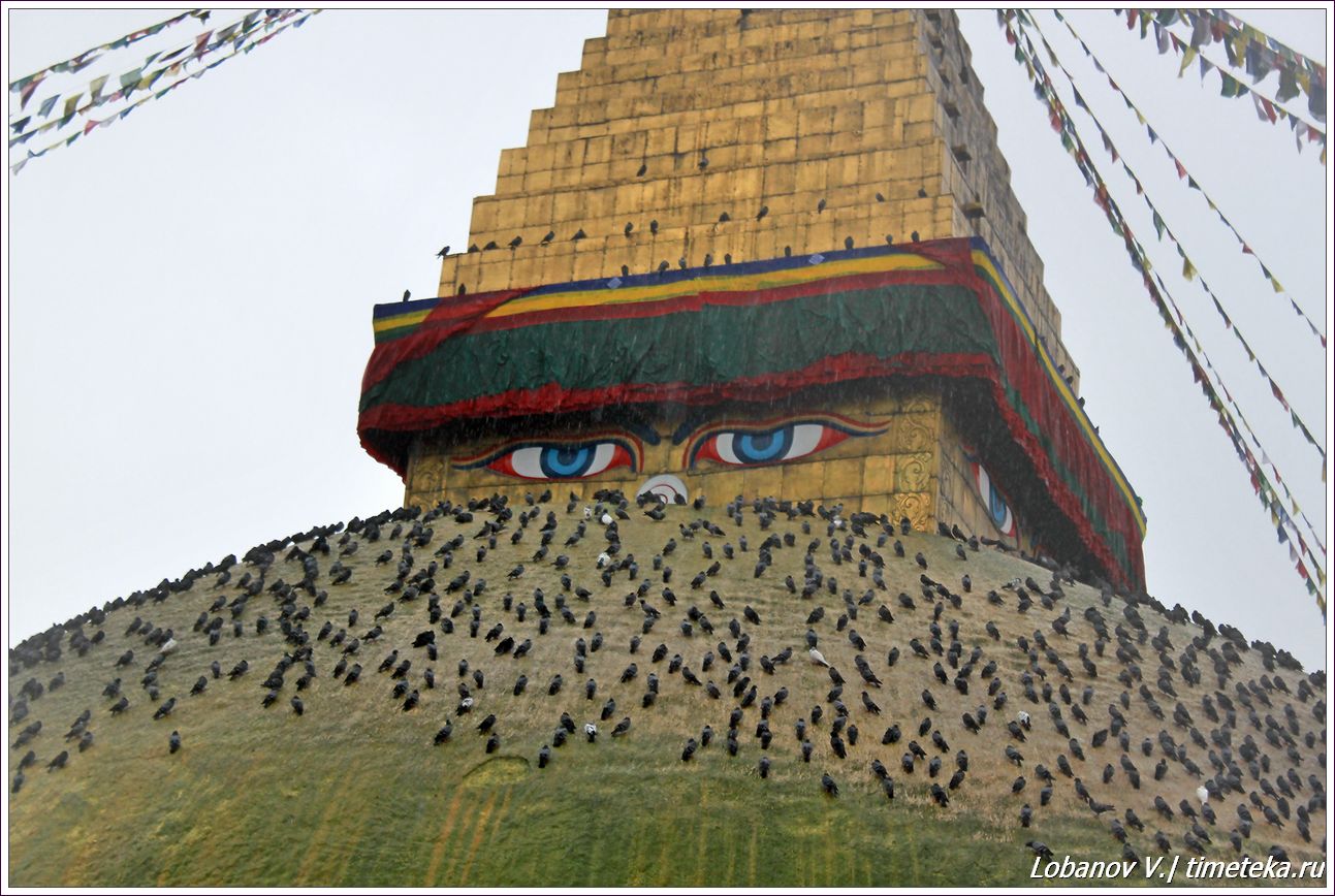 Ступа Боднатх (фото вверху в центре и справа), считается основным центром тибетского буддизма в Непале. Это сооружение является также излюбленным местом дислокации местных голубей, что видно на этих фотографиях. А на фото ниже — сами наглые голуби и не менее наглый представитель российского туризма в моем лице.