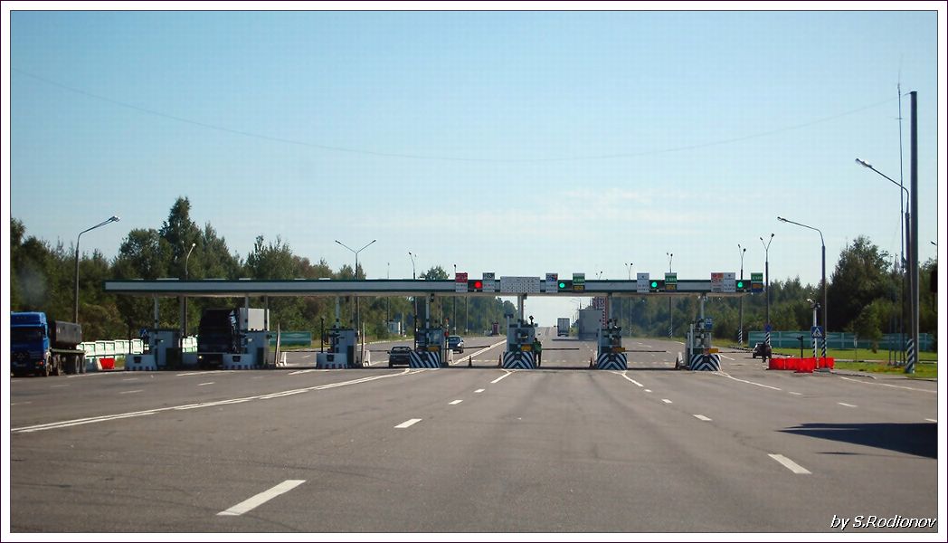 Пограничный и таможенный контроль на границе России и Беларуси для легковых отсутствует полностью! Скорость движения на территории пункта пропуска — 40 км/ч. На фото слева внизу: платная дорога начинается сразу после переезда границы.
