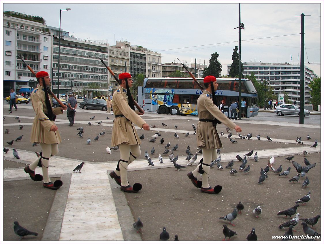 На площади Синтагма (Конституции) — центральной площади Афин находится Парламент Греции. Гвардейцы Национальной Гвардии — эвзоны — несут караульную службу, облаченные в колоритную греческую военную форму.
